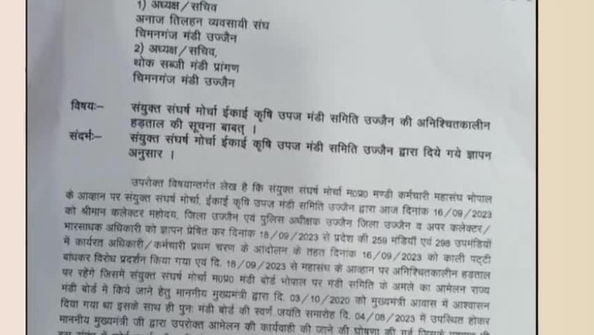 सुसनेर: 18 सितम्बर 2023 से मध्य प्रदेश की सभी मंडियों में हरताल। नोट्स हुए जारी। #मध्य_प्रदेष #hartal #मंडियां @मंडी