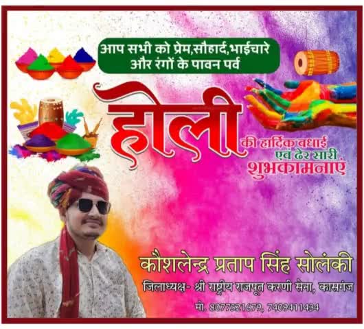*_आपको, आपके परिवार एवं आपके सभी प्रियजनों को प्रेम, सौहार्द, भाईचारे और रंगों के पावन पर्व #होली की हार्दिक बधाई एवं ढेर सारी शुभकामनाएं |_*🙏 *_कौशलेन्द्र प्रताप सिंह सोलंकी (एडवोकेट)_* *_जिलाध्यक्ष- कासगंज_*