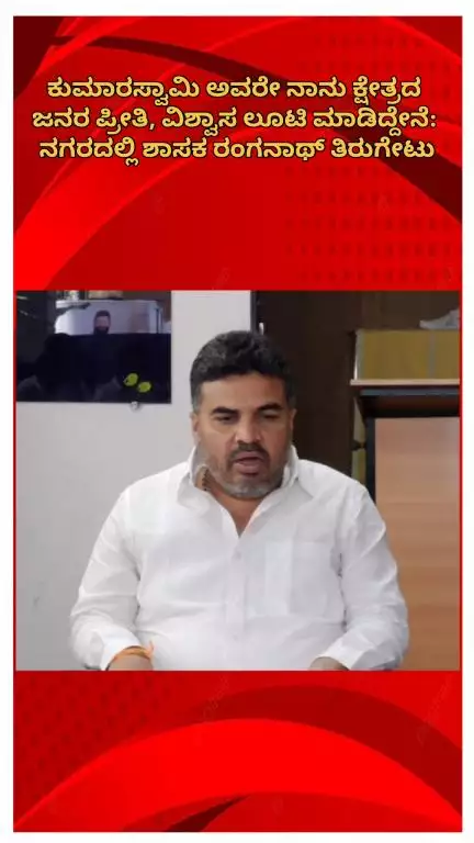 "ಕುಮಾರಸ್ವಾಮಿ ಅವರೇ, ನಾನು ಕುಣಿಗಲ್ ಜನತೆಯ ಪ್ರೀತಿ ಮತ್ತು ವಿಶ್ವಾಸವನ್ನು ಲೂಟಿ ಮಾಡಿದ್ದೇನೆ. ನೀವು ಹೇಳುವ ಅರ್ಥದ 'ಲೂಟಿ'ಯನ್ನು ನಾನು ಎಂದಿಗೂ ಮಾಡಿಲ್ಲ" ಎಂದು ಕುಣಿಗಲ್ ಶಾಸಕರಾದ ಹೆಚ್.ಡಿ. ರಂಗನಾಥ್ ಅವರು ತಿರುಗೇಟು ನೀಡಿದರು. ಬೆಂಗಳೂರಿನ ಬಸವೇಶ್ವರ ನಗರದ ಶಾಸಕರ ನಿವಾಸದಲ್ಲಿ ಬುಧವಾರ ಸಂಜೆ 6 ಗಂಟೆ ಸುಮಾರಿಗೆ ಮಾಧ್ಯಮಗಳ ಜೊತೆ ಮಾತನಾಡಿದ ಅವರು, "ಹಿರಿಯರಾದ ನಿಮ್ಮ ಮಾತು ಮತ್ತು ನಡವಳಿಕೆಗಳನ್ನು ನೋಡಿ ನಾವು ಅನುಸರಿಸಬೇಕು. ಆದರೆ ನೀವು ಇದಕ್ಕೆ ವಿರುದ್ಧವಾಗಿ ನಡೆಯುತ್ತಿದ್ದೀರಿ. ಈ ರೀತಿ ಪದ ಬಳಕೆ ಮಾಡುವುದನ್ನು ನಿಲ್ಲಿಸಿ. ನಮ್ಮಂತಹ ಯುವ ಶಾಸಕರ ತೇಜೋವಧೆ ಕೆಲಸ ಮಾಡಬೇಡಿ. ನಾನು ಲೂಟಿ ಮಾಡಿದ್ದರೆ ಇದಕ್ಕೆ ಪೂರಕವಾದ ದಾಖಲೆಗಳನ್ನು ಸಲ್ಲಿಸಿ" ಎಂದು ಸವಾಲು ಹಾಕಿದರು.