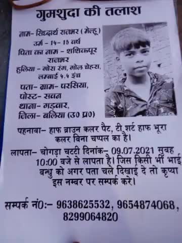 गुमशुदा की तलाश सिद्धार्थ निवासी परासिया पोस्ट सवन थाना गढ़वार जिला बलिया का निवासी है