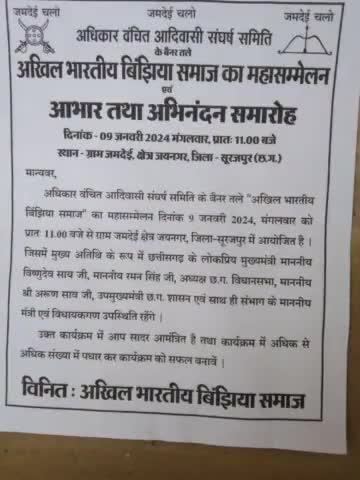 9 जनवरी मंगलवार को अखिल भारतीय बिंझिया सामाज का महासम्मेलन होगा,CM सहित कई मंत्री होंगे शामिल अतः आप सभी सादर आमंत्रित।