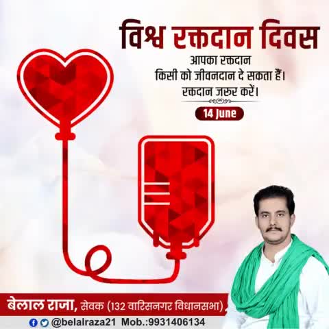 रक्तदान मानवता का सर्वोच्च कार्य है! 'रक्तदान से महादान' के महत्त्व को दीप्तिमान करने के श्रेष्ठ हेतु से विश्वभर में मनाए जाने वाले 'विश्व रक्तदान दिवस' की सभी को अनंत शुभकामनाएं।