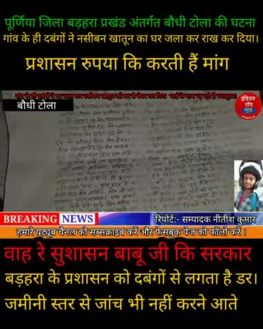 बरहरा: 13/07/2022 को गांव के ही दबंगों ने नसीमन खातुन का घर जलाकर राख कर दिया बरारा प्रखंड अंतर्गत बौधी टोला मुसलमान बस्ती में।