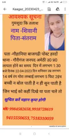 गुमशुदा की तलाश लड़की का नाम शिवानी पिता का नाम संतराम ग्राम पोस्ट गौहनिया पोस्ट हरदोई जिस भाई को लड़की देखें कृपया सूचन