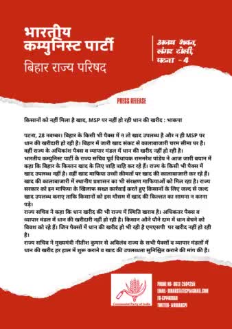 किसानों को नहीं मिला है खाद, MSP पर नहीं हो रही धान की खरीद : भाकपा