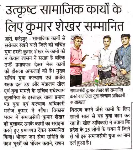 #फतेहपुर #भोजन #जन सेवा #समिति के संस्थापक #कुमार #शेखर को युवा कल्याण अधिकारी ने प्रमाण पत्र देकर सम्मानित किया