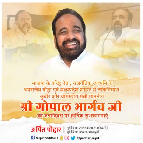 भाजपा के वरिष्ठ नेता, राजनैतिक रणभूमि के अपराजेय योद्धा एवं मध्यप्रदेश शासन में लोकनिर्माण, कुटीर और ग्रामोद्योग मंत्री माननीय श्री गोपाल भार्गव जी को जन्मदिवस पर हार्दिक शुभकामनाएं💐