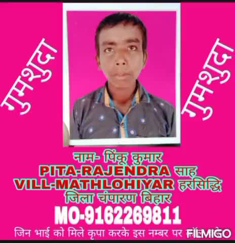 गुमशुदा गुमशुदा नाम पिंकू कुमार जिन भाई को मिले कृपा करके इस नंबर पर कॉल करे 9162269811 , 7739115649
