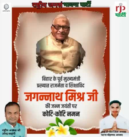 rashtriy jan sadbhavna party ke mananiy rashtriy adhyaksh #Upendra Sahni# ne# बिहार प्रदेश के पूर्व मुख्यमंत्री जगन्नाथ मिश्रा के जयंती पर श्रद्धा सुमन अर्पित किया है।