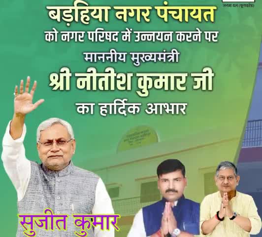 लखीसराय जिले के #बड़हिया नगर पंचायत को नगर #परिषद में उन्नयन करने पर माननीय मुख्यमंत्री श्री #NitishKumar जी व मुंगेर के लोकप्रिय यशस्वी सांसद माननीय श्री #ललन_बाबू का हार्दिक आभार ।