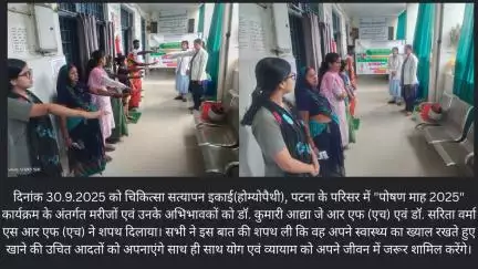 दिनांक 30.9.2025 को चिकित्सा सत्यापन इकाई(होम्योपैथी), पटना के परिसर में "पोषण माह 2025" कार्यक्रम के अंतर्गत मरीजों एवं उनके अभिभावकों को शपथ दिलाया।