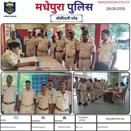 आज दिनांक- 28.09.25 को पुलिसअधीक्षक मधेपुरा के निर्देशानुसार सभी थानाध्यक्ष के द्वारा थाना परिसर में चौकीदारी परेड आयोजित किया गया एवं परेड में शामिल सभी चौकीदार को क्षेत्र में होने वाले अपराध एवं संदिग्ध व्यक्ति पर निगरानी रखने हेतू आवश्यक