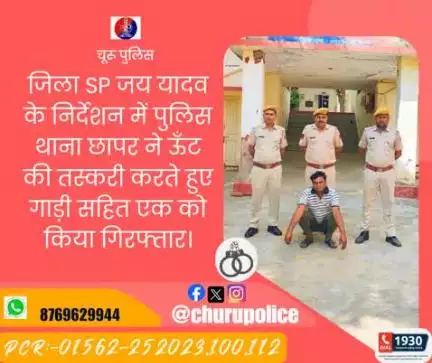 #churupolice जिला SP जय यादव के निर्देशन में पुलिस थाना छापर ने ऊँट की तस्करी करते हुए गाड़ी सहित एक को किया गिरफ्तार।