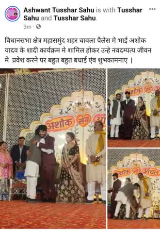 विधानसभा क्षेत्र महासमुंद शहर चावला पैलेस मे भाई अशोक यादव के शादी कार्यक्रम मे शामिल होकर उन्हे नवदम्पत्य जीवन मे प्रवेश करने पर बहुत बहुत बधाई एंव शुभकामनाए |