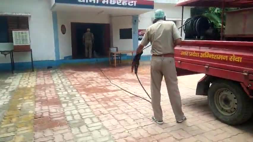 मिश्रिख: थाना मछरेहटा में थाना परिषर को सेनिटाइज करते फायर ब्रिगेड के जवान। #कोविड 19 से बचे मास्क पहने घर पर रहें।
