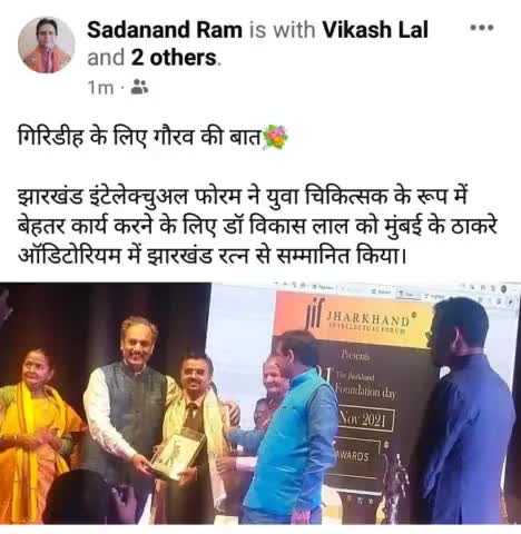 गिरिडीह के लिए गौरव की बात💐 झारखंड इंटेलेक्चुअल फोरम ने युवा चिकित्सक के रूप में बेहतर कार्य करने के लिए डॉ विकास लाल को मुंबई के ठाकरे ऑडिटोरियम में झारखंड रत्न से सम्मानित किया।