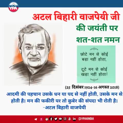 भारत के बेहतरीन नेता श्री अटल बिहारी वाजपेयी को उनकी जयंती पर विनम्र श्रद्धांजलि। राष्ट्र निर्माण में उनका योगदान अतुलनीय है। "The Nation Salutes Bharat Ratna....!!" #atalbiharivajpayeej #ypa #ypa4india
