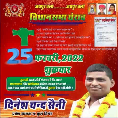 25फरवरी2022 को विधानसभा घेराव जयपुर चलो जयपुर चलो राष्ट्रीय फुले ब्रिगेड के द्वारा एवं सभी सैनी समाज राजस्थान के द्वारा