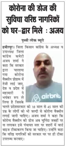 कोरोना की डोज अब पंचायत स्तर , वार्डवाइज ब वरिष्ठ नागरिकों को घर पर मुहैया करवाए : अजय शर्मा