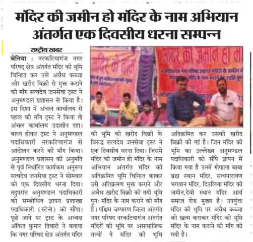 मंदिर की जमीन हो मंदिर के नाम अभियान के तहत सत्यदेव जनसेवा ट्रस्ट के बैनर तले दिए गए कल अनुमंडल कार्यालय नरकटियागंज के धरना स्थल पर हुए कार्यालय के द्वारा शांति पूर्ण तरिके से सम्पन्न हुए।
