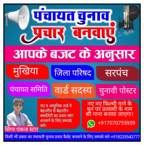 नए व आधुनिक तर्ज़ पे बेहतरीन से बेहतरीन क्वालिटी का प्रचार सांग बनवाने के लिए सम्पर्क करें। 7070755959 8235543777