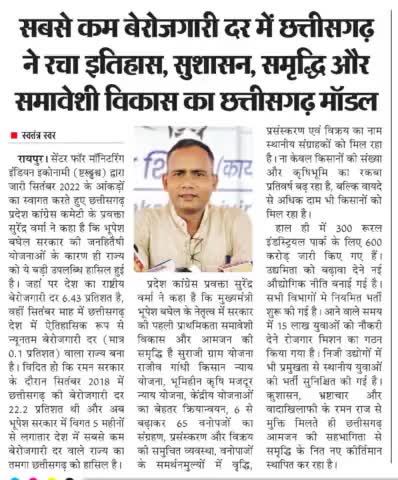 सबसे कम बेरोजगारी दर में छत्तीसगढ़ ने रचा इतिहास, सुशासन, समृद्धि और समावेशी विकास का छत्तीसगढ़ मॉडल #छत्तीसगढ़ #Chhattisgarh #छत्तीसगढ़_मॉडल #chhattisgarhmodel