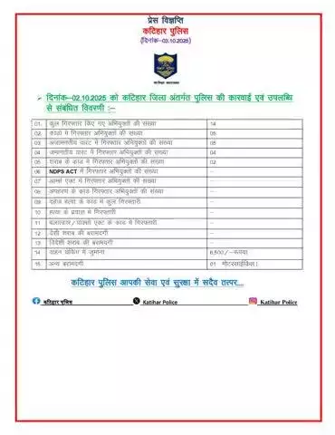 कटिहार जिलान्तर्गत विगत 24 घंटे में पुलिस द्वारा की गयी कार्रवाई एवं उपलब्धि से संबंधित विवरणीः-