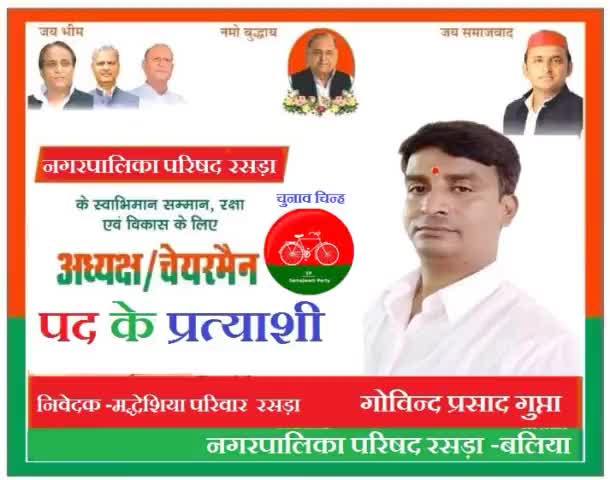 रसड़ा नगर पालिका परिषद समाजवादी पार्टी के अध्यक्ष प्रत्याशी गोविंद प्रसाद गुप्ता को चुनाव निशान 🚲 साइकिल पर वोट देकर जीताने की कृपा करें ।।जय भीम जय समाजवाद।।