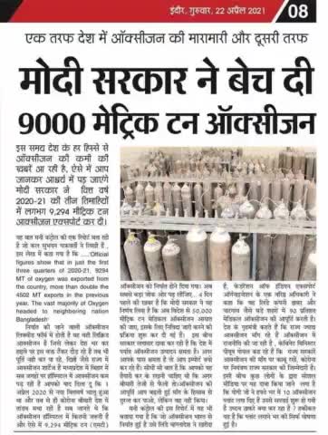 देश कोरोना महामारी से झुज रहा है जनता परेशान है उनको ऑक्सीजन मुहैय्या सरकार करा नही पा रही है और ऑक्सीजन बेच रही है ??