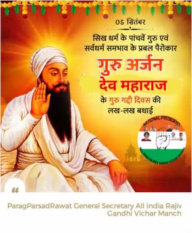 सिख धर्म के पांचवें गुरु एवं सर्व धर्म के पैरोकार गुरु अर्जन देव महाराज के गुरु गद्दी दिवस कि लख -लख बधाई। पराग प्रसाद रावत राष्ट्रीय महासचिव अखिल भारतीय राजीव गांधी विचार मंच