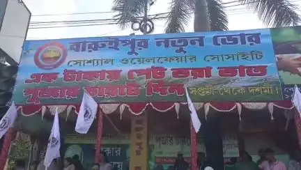পুজোর চার দিন এক টাকায় পেট ভরে ভাত, বারুইপুরে বারইপুর নতুন ভোর সোশ্যাল ওয়েলফেয়ার সোসাইটির উদ্যোগে সকলের ভালোবাসায় এবার চতুর্থ বর্ষে আবার এক টাকার বিনিময়ে পেট ভরা ভাত খাওয়ার ব্যবস্থা করা হয়েছ। প্রতিদিন এই এক টাকার বিনিময়ে পেট ভরে ভাত 1000 জনকে দেয়া হবে। আজ শুরু হলো এক হাজার জনের এই ১ টাকার পেট ভরা ভাত খাওয়ার ব্যবস্থা। সেই চিত্র পাবলিক অ্যাপ এর ক্যামেরায় সোমবার দুপুর আনুমানিক বারোটা নাগাদ।