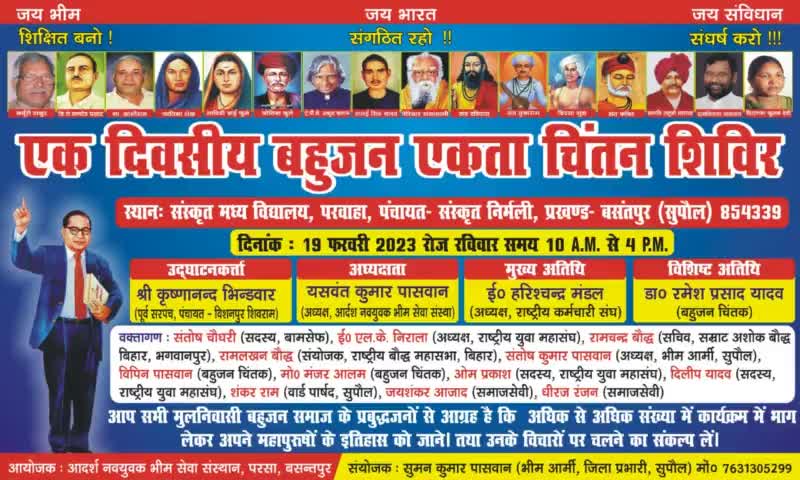 कल होगा संस्कृत निर्मली में एक दिवसीय बहूजन चिंतन शिविर शरीक होंगे कई बहूजन विचारधारा से जुड़े नेता कार्यकर्ता