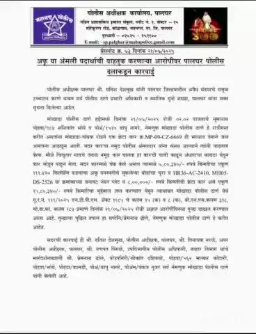 अफु या अमली पदार्थाची वाहतूक करणाऱ्या आरोपीवर पालघर पोलीस दलाकडून यशस्वी कारवाई.
