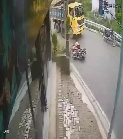 सचमुच बाल-बाल बचा! #भीमताल में बाइक से गिरा व्यक्ति सामने से आते ट्रक के नीचे आने से पल भर में बच गया।