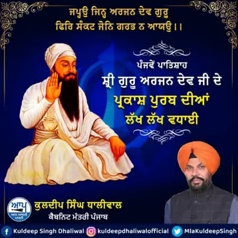 ਪੰਜਵੇਂ ਪਾਤਿਸ਼ਾਹ ਸ਼੍ਰੀ ਗੁਰੂ ਅਰਜਨ ਦੇਵ ਜੀ ਦੇ ਪ੍ਰਕਾਸ਼ ਪੁਰਬ ਦੀਆਂ ਲੱਖ ਲੱਖ ਵਧਾਈਆਂ।