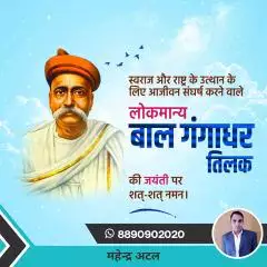 देश की स्वाधीनता हेतु अपना सर्वस्व अर्पित करने वाले 'लोकमान्य' बाल गंगाधर तिलक जी की जयंती पर उन्हें विनम्र श्रद्धांजलि!