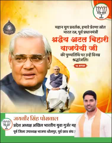 भारतीय राजनीति के अजातशत्रु, असंख्य कार्यकर्ताओं के पथ प्रदर्शक एवं हमारे प्रेरणा स्रोत, देश के पूर्व प्रधानमंत्री 'भारत रत्न' श्रद्धेय अटल बिहारी वाजपेयी जी की पुण्यतिथि पर उन्हें भावभीनी श्रद्धांजलि
