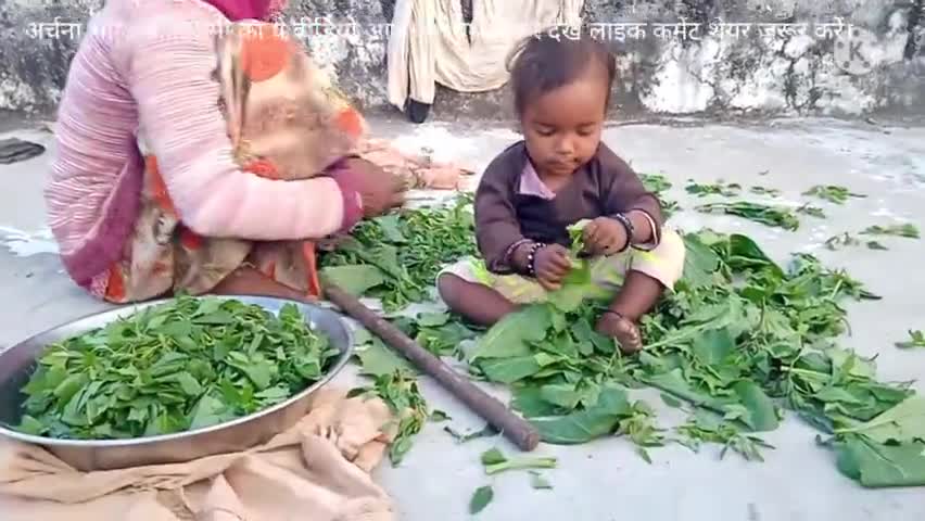 अर्चना भील आदिवासी सरसों के पत्ते साफ करती हुई।