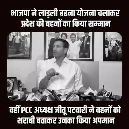 मध्य प्रदेश कांग्रेस अध्यक्ष जीतू पटवारी ने बहनों को शराबी बताकर उनका किया अपमान।