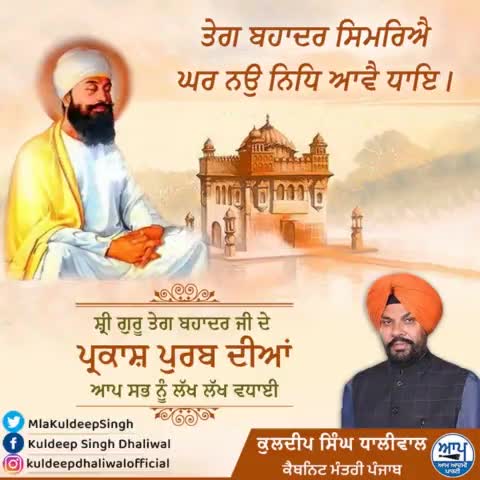 ਹਿੰਦ ਦੀ ਚਾਦਰ ਸ਼੍ਰੀ ਗੁਰੂ ਤੇਗ ਬਹਾਦਰ ਸਾਹਿਬ ਜੀ ਦੇ ਪ੍ਰਕਾਸ਼ ਪੁਰਬ ਦੀਆਂ ਆਪ ਸਭ ਨੂੰ ਲੱਖ ਲੱਖ ਵਧਾਈ।