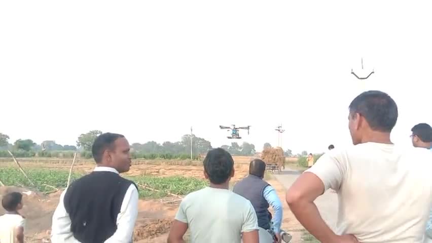 ड्रोन कैमरा जहांज से दवा छिड़काव करते हुए