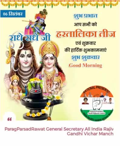 आप समस्त् देशवासियों मित्रों को परिवार सहित हर तालिका तीज के पावन पर्व पर अनंत् हार्दिक शुभकामनाएं । पराग प्रसाद रावत राष्ट्रीय महासचिव अखिल भारतीय राजीव गांधी विचार मंच