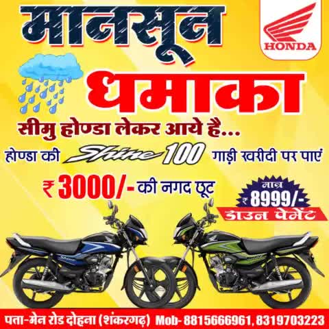 प्रत्येक Shine100 की खरीदी पर पाए 3000 रूपए की नकद छूट....🙏🙏 सिमु होंडा मेन रोड दोहना शंकरगढ़..9165955400
