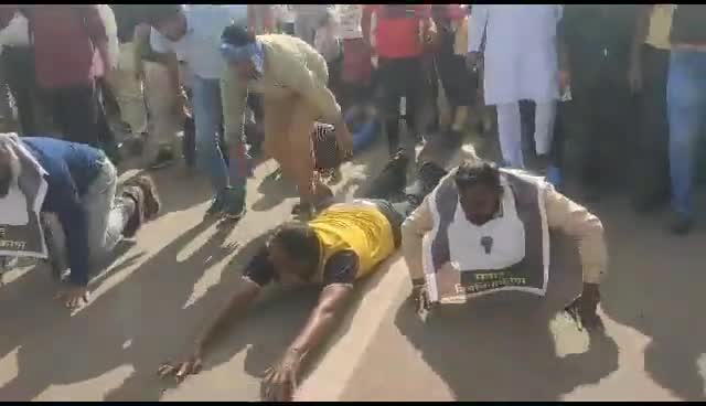 एस्मा कानून के विरोध और नियमितीकरण की मांग को लेकर संविदा कर्मचारी घुटने एवम दंडवत चलकर किया प्रदर्शन