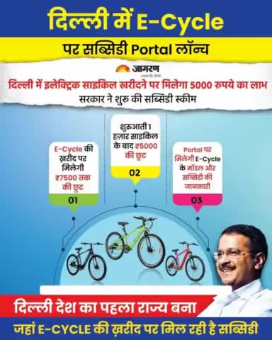 केजरीवाल सरकार का ऐतिहासिक फैसला, दिल्ली में अब E-Cycle पर भी मिलेगी Subsidy ➡️ E-cycle की खरीद पर मिलेगी ₹7500 तक कि छुट ➡️ शुरुआती 1 हजार ई-साइकिल के बाद 5000 रुपए की छुट