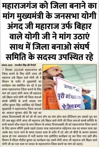 7 सितंबर 2025को महाराजगंज को जिला बनाने के लिए योगी अंगद जी महाराज उर्फ बिहार वाले योगी जी ने सिवान के पपौर में मुख्यमंत्री का कार्यक्रम जब संबोधित कर रहे थे इस समय महाराजगंज जिला बनाने के लिए मांग को उठाएं योगी अंगद जी महाराज उर्फ बिहार वा