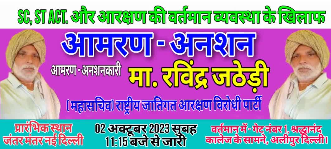 रवींद्र जठेड़ी के आमरण अनशन के समर्थन में 05 नवंबर को उतरेंगे देश भर से आरक्षण विरोधी पार्टी और संगठन :- खरब