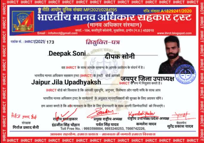 भारतीय मानव अधिकार सहकार ट्रस्ट में दीपक सोनी का राजस्थान जयपुर जिला उपाध्यक्ष के पद् पर स्वागत है 💐💐💐💐💐💐💐💐💐💐