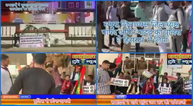 बीजेपी कार्यालय के बाहर सपाइयों ने लगाया बैनर । सयुस जिलाध्यक्ष को पुलिस ने हिरासत मे लिया , समर्थकों ने की नारेबाजी