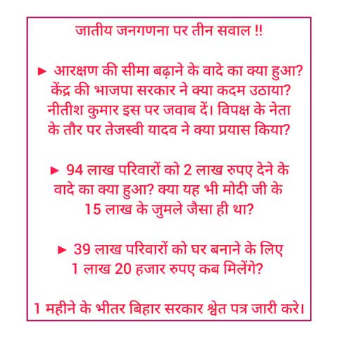 जातीय जनगणना पर तीन सवाल !! ▶️ आरक्षण की सीमा बढ़ाने के वादे का क्या हुआ? केंद्र की भाजपा सरकार ने क्या कदम उठाया? नीतीश कुमार इस पर जवाब दें। विपक्ष के नेता के तौर पर तेजस्वी यादव ने क्या प्रयास किया?